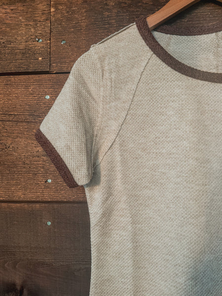 Embrace laid-back rustic charm with The Timberline Tee — a cozy, textured crewneck top with rich brown contrast trim that brings warmth to your casual wardrobe. Crafted for comfort and style, this tee pairs perfectly with your favorite plaid skirts or worn-back denim for an effortlessly grounded look.