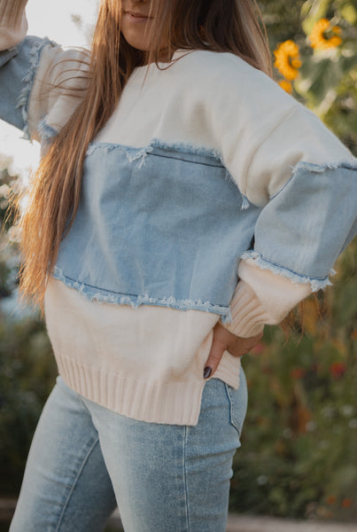 Fall layering just got a bold upgrade. The Sierra Sweater blends soft knits with raw-edged denim panels for a playful, textured twist on the everyday pullover. With its relaxed silhouette, ribbed trim, and modern colorblock design, it’s an easy statement piece you’ll reach for again and again.