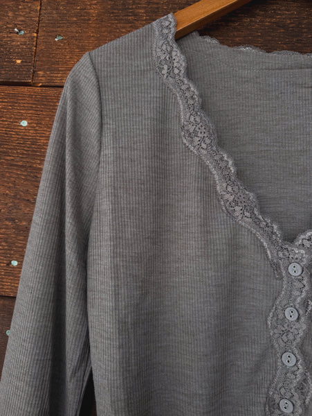 Sweet, simple, and effortlessly flattering — the Annie Lace Trim Knit Top in Grey is your new layering favorite. Designed with a soft ribbed knit that hugs in all the right places, it features delicate lace trim along the neckline, a button-down front, and a subtly scalloped hem. The fitted silhouette and deep wine hue make it perfect for pairing with skirts, denim, or layered under your favorite jackets.